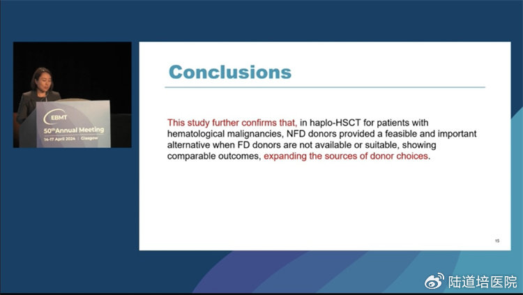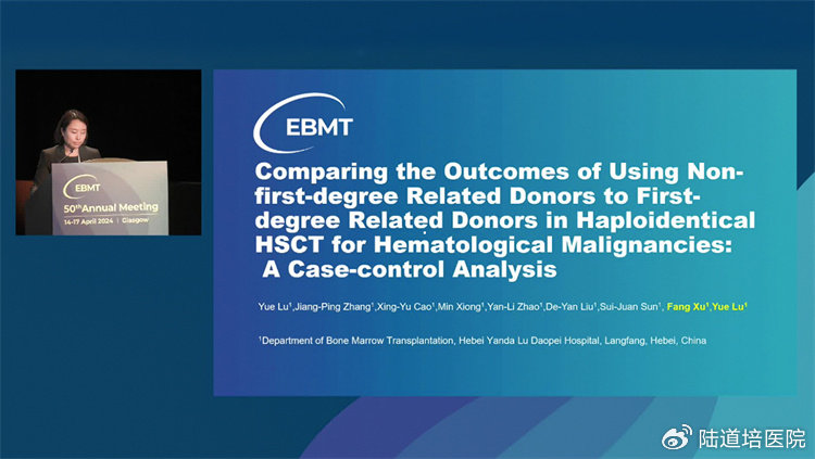 當(dāng)?shù)貢r間,4月16日下午15:15,由陸道培醫(yī)院骨髓移植科胥方醫(yī)生代表盧岳主任團(tuán)隊在“Optimising donor Choice”環(huán)節(jié)中,口頭匯報了“Comparing the Outcomes of Using Non-First-Degree Related Donors to First-Degree Related Donors in Haploidentical HSCT for Hematological Malignancies: A Case-Control Analysis”的臨床研究成果,研究證實(shí)了在單倍體造血干細(xì)胞移植中,采用非直系供體在療效及安全性方面均可以與直系供體相媲美,這也為臨床上擴(kuò)展單倍體移植供者的可選擇范圍提供了進(jìn)一步的證據(jù)支持。盧岳主任團(tuán)隊這一項研究受到了頗多關(guān)注。