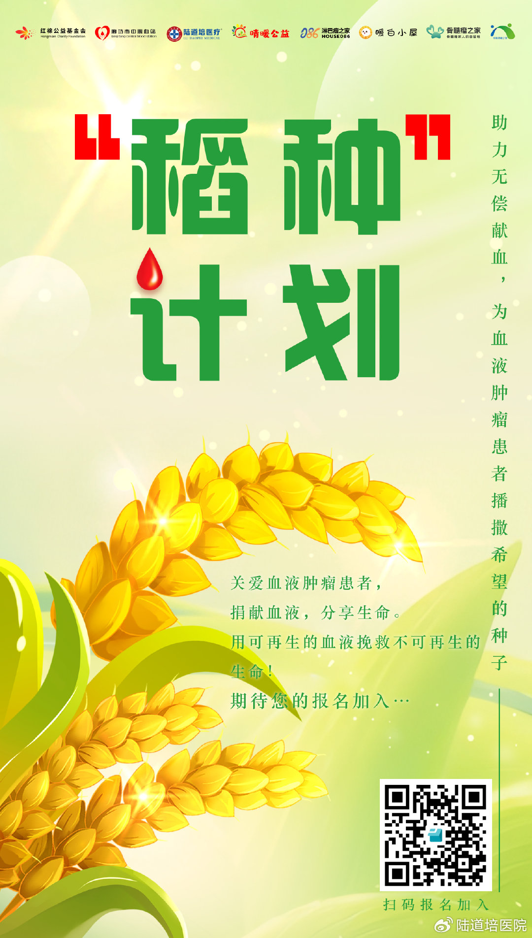 在第20個(gè)世界獻(xiàn)血者日來臨之際,為緩解臨床用血緊張,積極響應(yīng)世界衛(wèi)生組織關(guān)于獻(xiàn)血者日的號(hào)召,進(jìn)一步推動(dòng)無(wú)償獻(xiàn)血事業(yè)的發(fā)展,陸道培醫(yī)院聯(lián)合廊坊市中心血站、紅棉公益基金會(huì)、晴暖公益及血液腫瘤患者組織淋巴瘤之家、暖白小屋、骨髓瘤之家和血液系統(tǒng)疾病患者組織卡斯特曼之家一起組織發(fā)起“稻種計(jì)劃”,開展主題為“助力無(wú)償獻(xiàn)血,為血液腫瘤患者播撒希望的種子”的無(wú)償獻(xiàn)血日活動(dòng)。